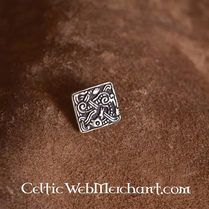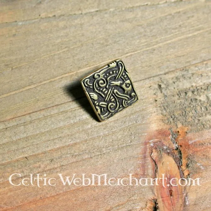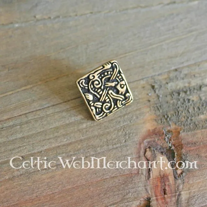 This belt fitting is a replica of a 9th-10th century original. It can be used for decorating leather items like belts and bags. This belt fitting measures 1,8 x 1,7 cm and is perfectly suited for a belt strap with a width of 2 cm. It is bronze coloured.