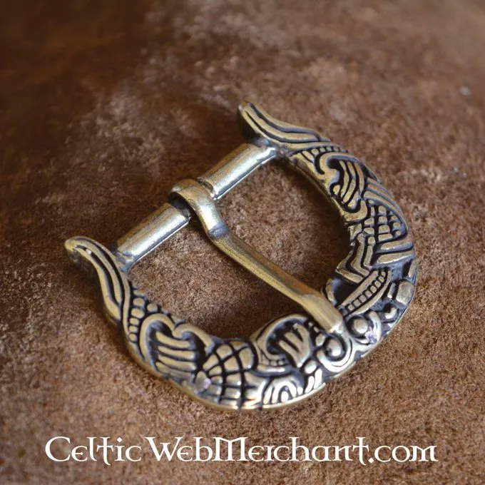 This Viking buckle is based on motives in two Viking art styles from the 9th-10th century. It is suitable for belt straps with a width of 3 cm and it measures 4,5 x 4,5 cm. It is bronze coloured.