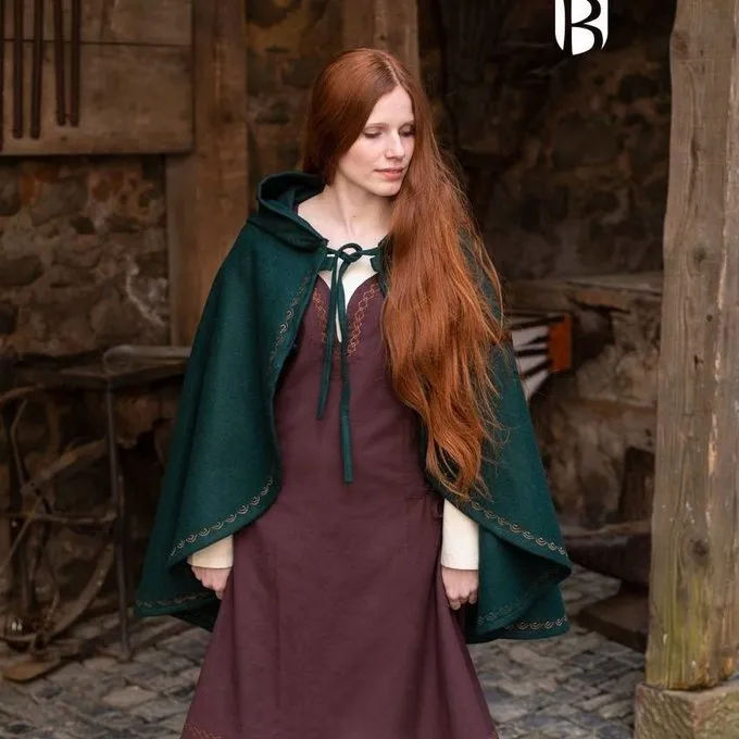 This beautiful, short cape made of warm wool felt is perfect for LARP, Cosplay and re-enactment. The different lengths on the front and back, the long pointed hood and especially the ornamental embroidery give the cape and the wearer an extraordinary, unique look. The cloak can be closed by a double lacing. The Cape Affra can also be worn by children as a long coat, it is suitable for everyone longer than 120 cm. This wool felt model is ideal for cold days. The material is durable, wind and water repellent.