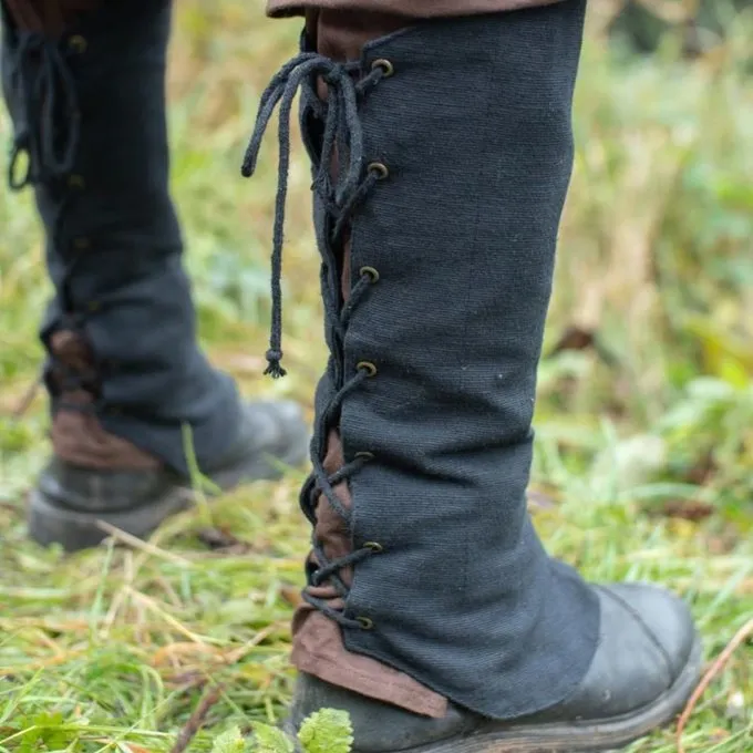 These gaiters are sold in pairs. They cover the shins completely and you can fasten them at the back with laces. Ideal for fantasy and LARP characters as an accessory over trousers.