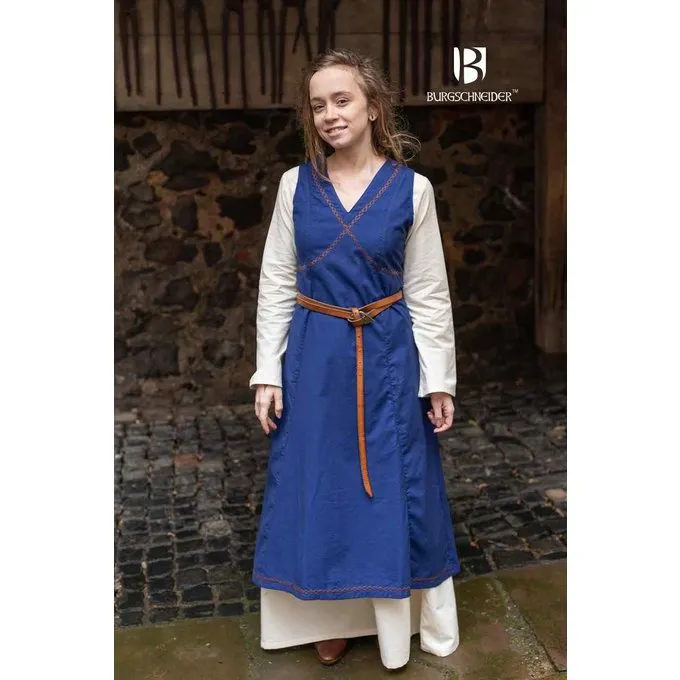 This light, sleeveless dress in fine cotton hugs the upper body and is fitted to the figure with a lacing at the back. The dress has a V-neckline with decorative embroidery, which continues at the hem. The Khara dress can be worn as an overdress in combination with a long tunic or dress.