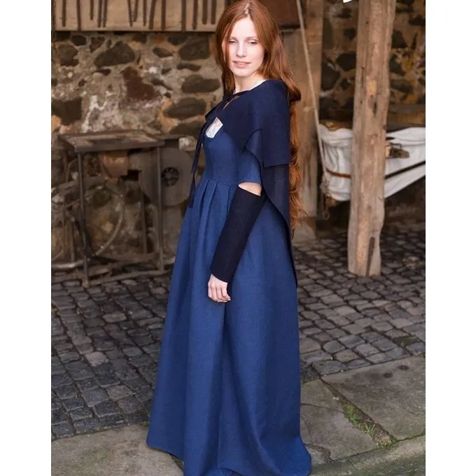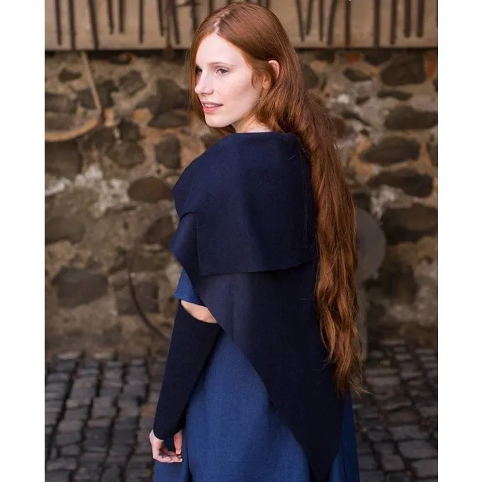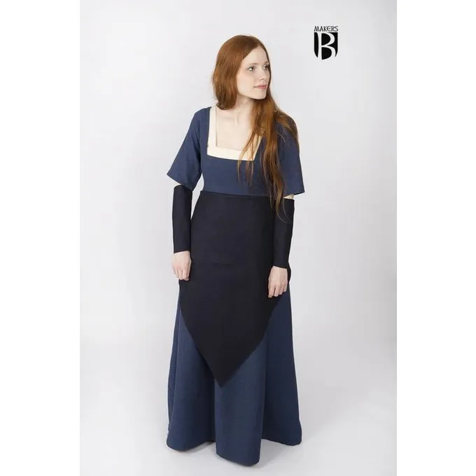 This apron is based on medieval originals shown in various manuscripts. It is multifunctional: it can be used as an apron and as a short cloak. It can even be used as a head scarf.