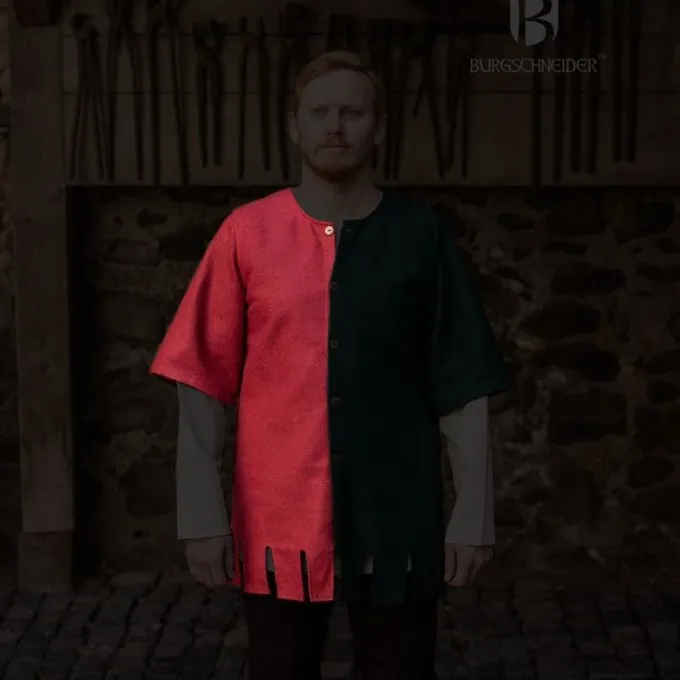 Discover the new Mi Parti collection from Burgschneider! The surcoat Aleran consists of two halves that are sold separately. This way you can put together a mi parti surcoat as desired. Fasten the left side to the right side with the buttons. If you are in different medieval LARP and reenactment groups, you can make a lot of different color combinations with a few left and right sides. The surcote is a piece of clothing that dates back to the 12th century. It was worn above the other clothes, with a lot of heraldry and decorative elements. It served to clearly distinguish friend from foe in the heat of battle! The Surcoat “Aleran” is made of a heavy wool fabric with a deep color, suitable for all weather conditions. From the 11th to the 16th century, the “mi-parti” (partially colored) style of dress was popular, connecting two different colored fabrics in the middle. The effect is a color contrast that often creates a dramatic look. In the Middle Ages, Mi-parti was an important style among cloaks, tabards, dresses, trousers and dresses. The earliest examples of this style date back to the 9th and 10th centuries, where the split colors were used on legs and shoes. For example, the boots were half one color and half the other color. In the High Middle Ages, the mi parti style grew in popularity as color symbolism in clothing became more important. The colors often stood for a certain status or a certain connection. The style became more common in the 13th and 14th centuries when many men, especially vassals, imitated the coats of arms of their feudal lords. Towards the end of the 16th century, the style gradually declined.
