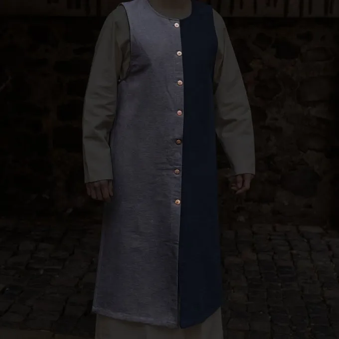 Discover the new Mi Parti Burgschneider collection! The tabard Auderic consists of two halves that are sold separately. This way you can compose a mi parti tabard as desired. Fasten the left side to the right side with the buttons. If you are in different medieval LARP and reenactment groups, you can make a lot of different color combinations with a few left and right sides. The tabard is a piece of clothing that can be found as early as the 12th century. It was worn above the other clothes, with a lot of heraldry and decorative elements. It was worn by, for example, a herald so that one could see what the heraldry was. You can also wear a tabard as a surcoat. This tabard is made of a heavy cotton with a deep color, suitable for all weather conditions. From the 11th to the 16th century, the “mi-parti” (partially colored) style of dress was popular, connecting two different colored fabrics in the middle. The effect is a color contrast that often creates a dramatic look. In the Middle Ages, Mi-parti was an important style among cloaks, tabards, dresses, trousers and dresses. The earliest examples of this style date back to the 9th and 10th centuries, where the split colors were used on legs and shoes. For example, the boots were half one color and half the other color. In the High Middle Ages, the mi parti style grew in popularity as color symbolism in clothing became more important. The colors often stood for a certain status or a certain connection. The style became more common in the 13th and 14th centuries when many men, especially vassals, imitated the coats of arms of their feudal lords. Towards the end of the 16th century, the style gradually declined.