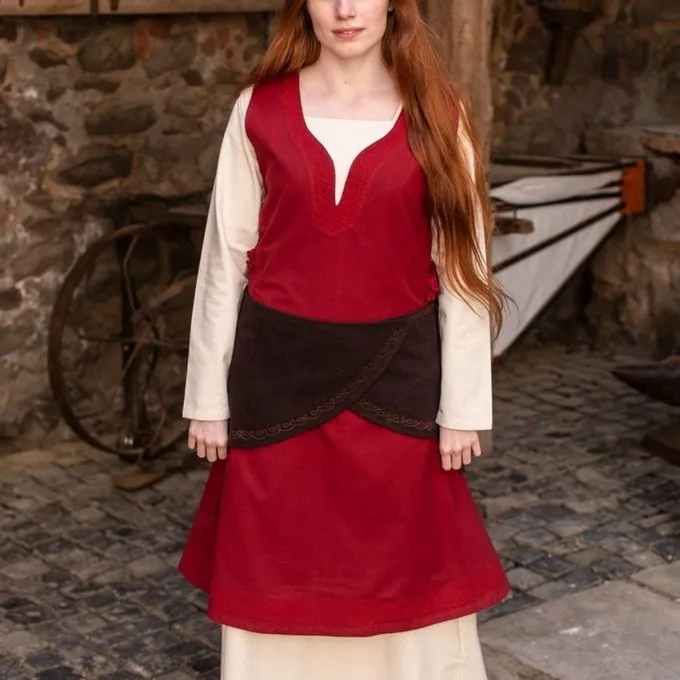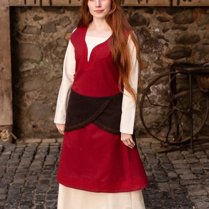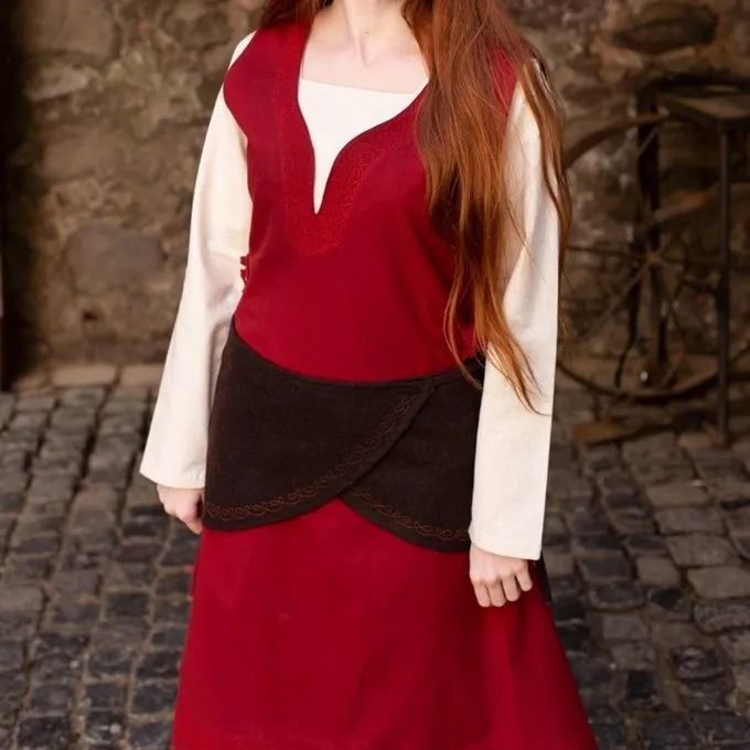 This wrap belt is made of wool and can be worn as an apron. At the ends there are cords for fabrics so that you can drape the belt around your waist as an apron. The bottom is richly decorated with a decorative knot motif made of imitation gold thread. This fabric belt gives extra allure to your re-enactment or Larp outfit.