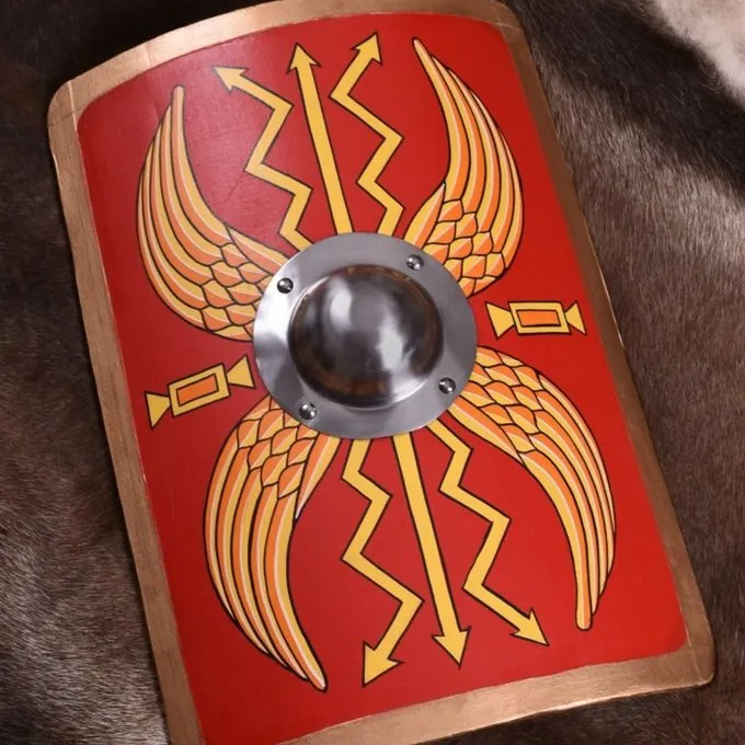 This Roman shield for children (scutum) is made after originals that were used by Roman legionaries. This type of shield was carried all over the Roman Empire between the 1st until the 2nd century AD. This small scutum is very light for children to carry. The design completely corresponds with the larger original models.