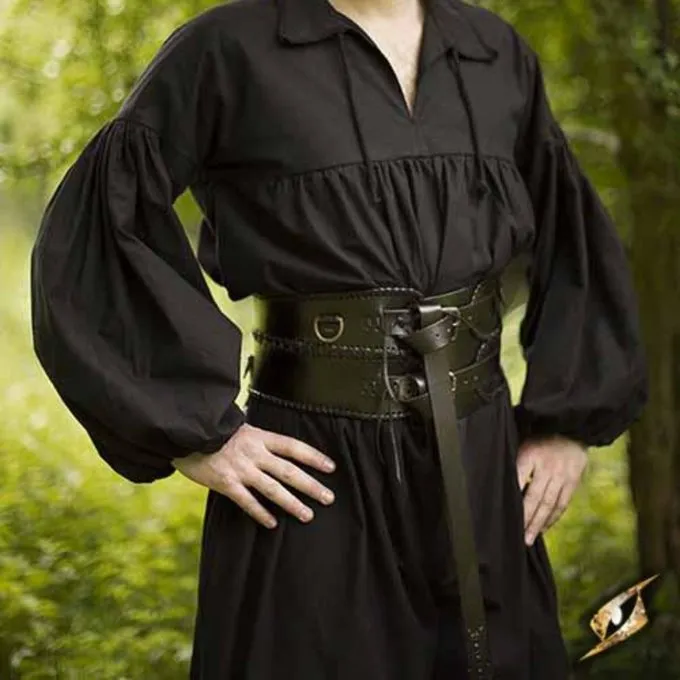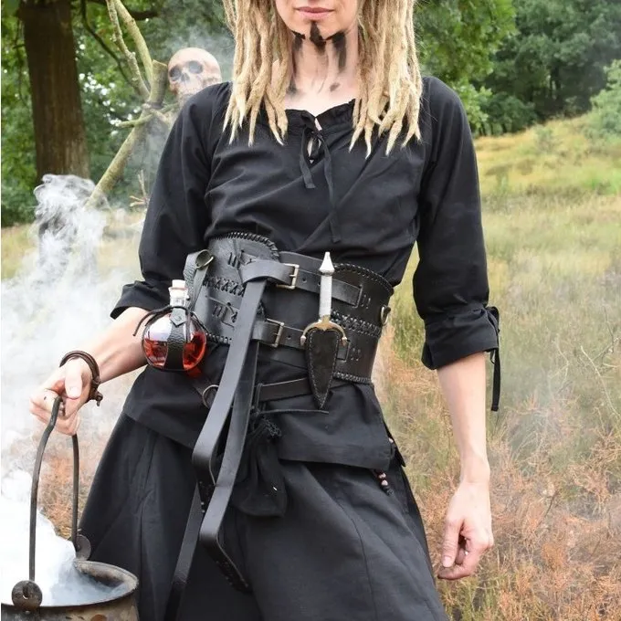 This beautiful belt is made from a high quality vegetable tanned full-grain leather. The belt has a hand-stitched finish with leather laces over the entire width and length. A wonderful accessory for your LARP or Cosplay outfit! The belt has D-shaped rings on which you can hang various objects to customize your outfit, like knives or potion bottles. The back consists of a, even leather surface with the beautiful hand-stitched finish. The belt can easily be fastened with the two leather belt tongues.