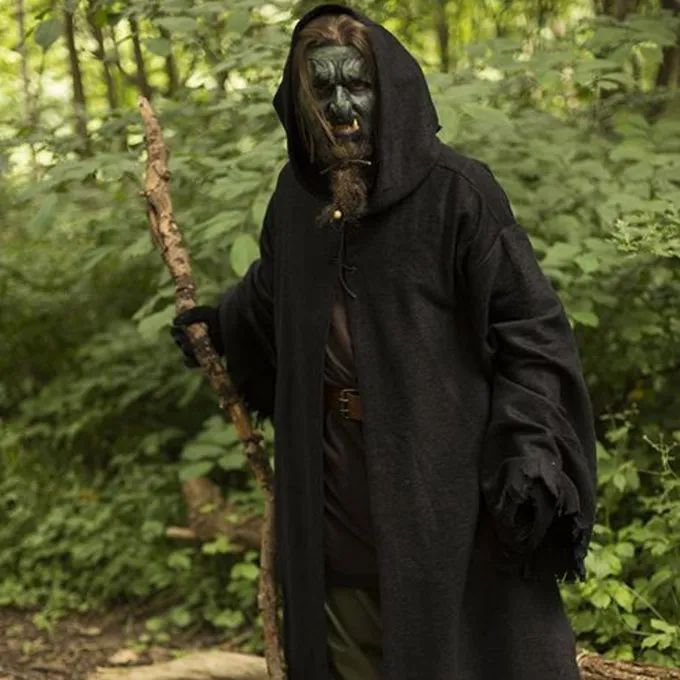Traditionally, robes were worn in religious settings, for example by monks and priests. In traditional fantasy literature, this has become the garment of magical characters. This robe is designed to look worn and frayed. It is made of textured cotton, which looks like a rough jute-like fabric, and is frayed on all edges. If you are LARPing an orc, troll or other monsterly creature or outcast, this is a perfect garment to wear over your costume. Due to the rough finish and the hood that you can wear over the head, the robe gives you a creepy and evil look. This makes it also extremely suitable for Halloween and theater. The cloak is suitable for outdoor wear in all seasons and protects against rain and cold. You can fasten the robe to the neck with a leather lace and a leather strip.