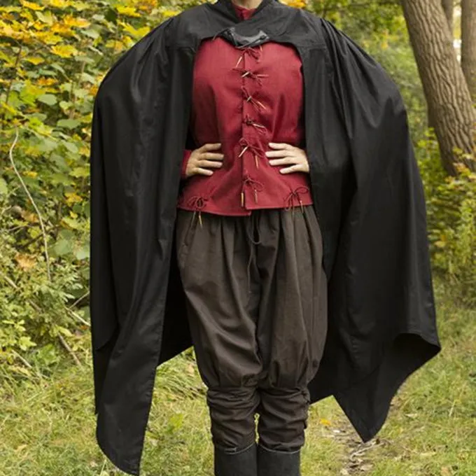 This cloak reaches to around the knees and can be fastened around the neck with a leather cord. The cloak has an open front and leaves your hands free during battles. At the back the mantle has a beautiful symmetrical effect: in the middle it is shorter than on the sides. The collar on the top with its leather decoration is also an eye-catcher. A great comfortable cloak for all your LARP and Cosplay characters.