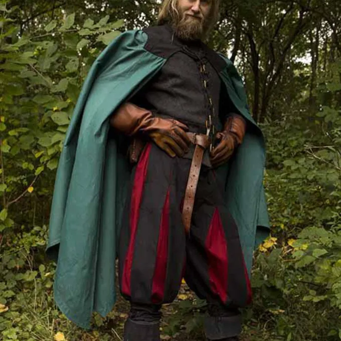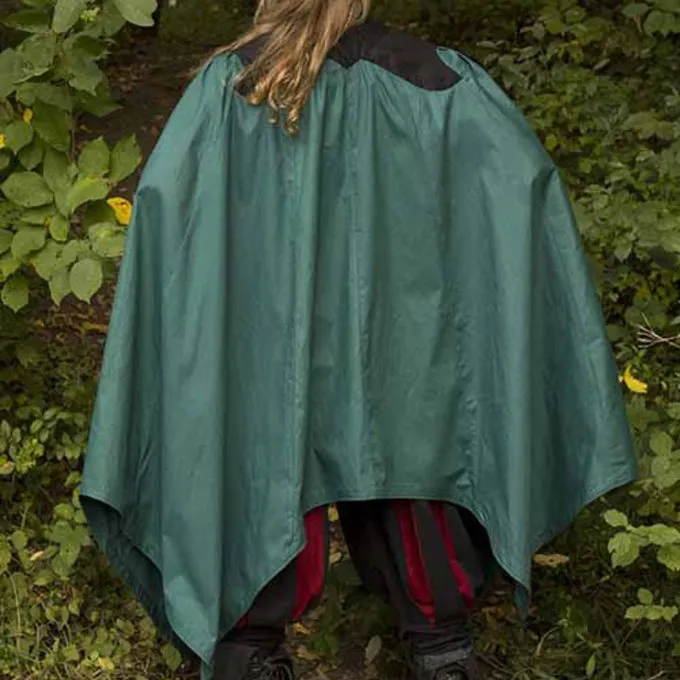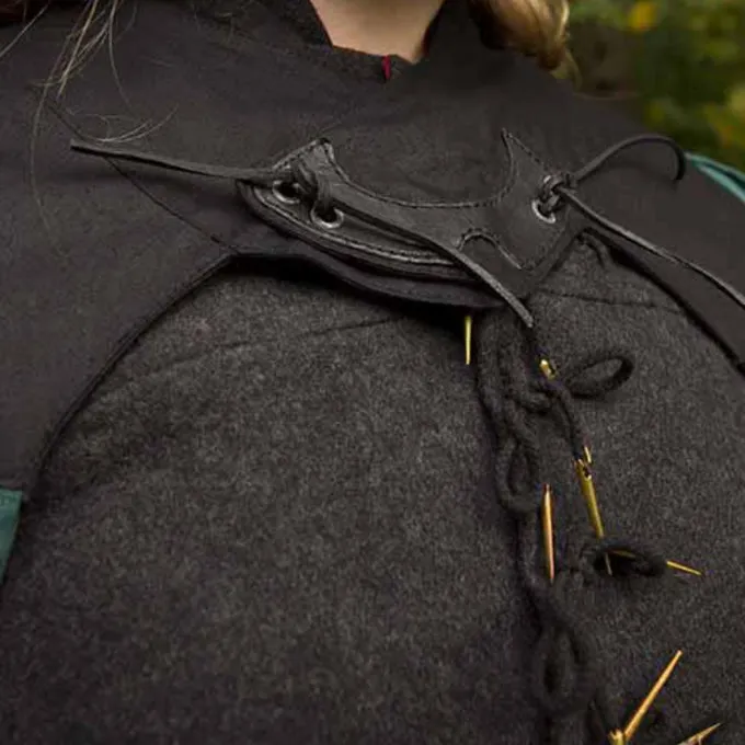 This cloak reaches to around the knees and can be fastened around the neck with a leather cord. The cloak has an open front and leaves your hands free during battles. At the back the mantle has a beautiful symmetrical effect: in the middle it is shorter than on the sides. The contrasting collar on the top with its leather decoration is also an eye-catcher. A great comfortable cloak for all your LARP and Cosplay characters.