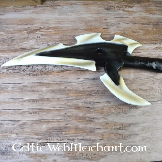 Dark Elven war axe. This LARP axe is 100 cm long, the axe head is approx. 32 cm long and 55 cm high, it weighs 345 g. The axe has a flexible fibre glass core with a layer of durable foam, coated with a strong layer of latex. The axe is handmade and manually colored so every item is unique. Because of the material we do not recommend leaving the axe in the sun for a longer period of time. The Dark Elven war axe by Epic Armoury meets high safety standards.
