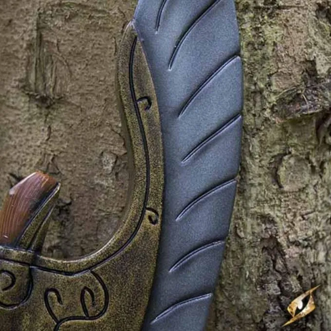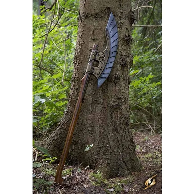 This huge LARP battle axe is 150 cm long. It is painted lifelike and looks like it is made of wood, steel and gold. The axe blade is crescent-shaped and symbolizes an elven or bird wing, this design is therefore specially designed for elven characters. The gold-colored part depicts an elegant decoration in the elven art style. Perfect for taking out your enemies during LARP battles.
