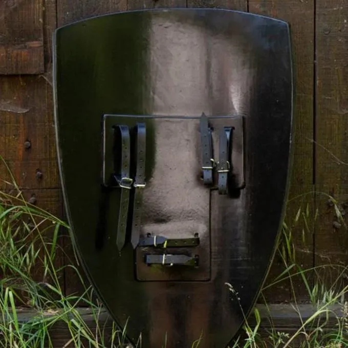 This LARP shield is based on the kite shields that were used in Western Europe during the Middle Ages (12th century). A perfect shield for medieval LARP or other scenarios. The shield shows a black cross on a white background. The shield is painted very realistic and therefore appears to have a surface of painted wood. The back has various leather straps, so that it can be worn on both the left and right arms.
