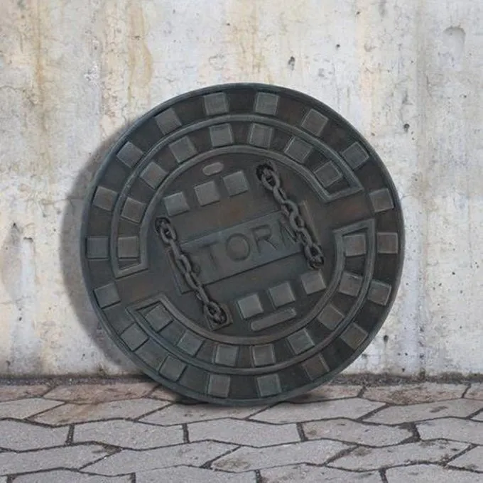 This LARP shield is based on the American manhole covers. This latex shield is painted to appear lifelike and was designed by Epic Armouries in the Dark Moon series, a modern and post-apocalyptic LARP series. This shield has a fiberglass core covered with Kevlar. The skin is made of foam.