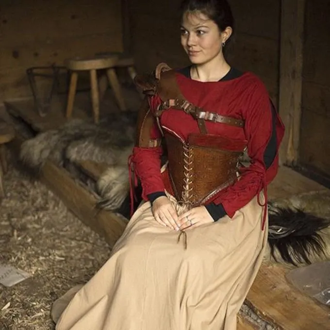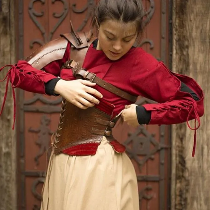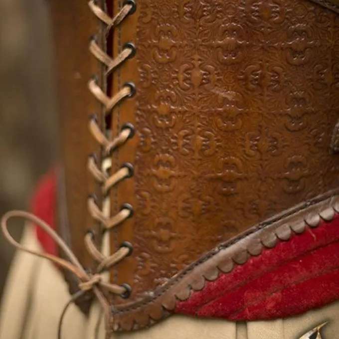 With this beautiful leather corset you can create the most beautiful LARP, Cosplay and steampunk outfits. This corset is worn under the breasts and is made of sturdy durable bovine leather. The corset is completely decorated with an elaborate embossed pattern. The outer edge of the corset has a symmetrical pattern and is trimmed with colored velvet. With the leather laces at the front and the buckles at the side, the corset can be adjusted to your size.