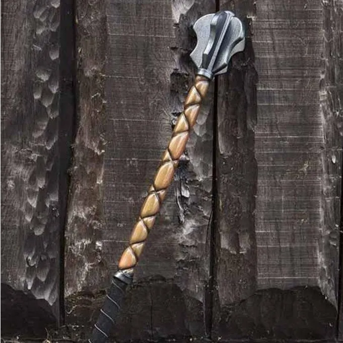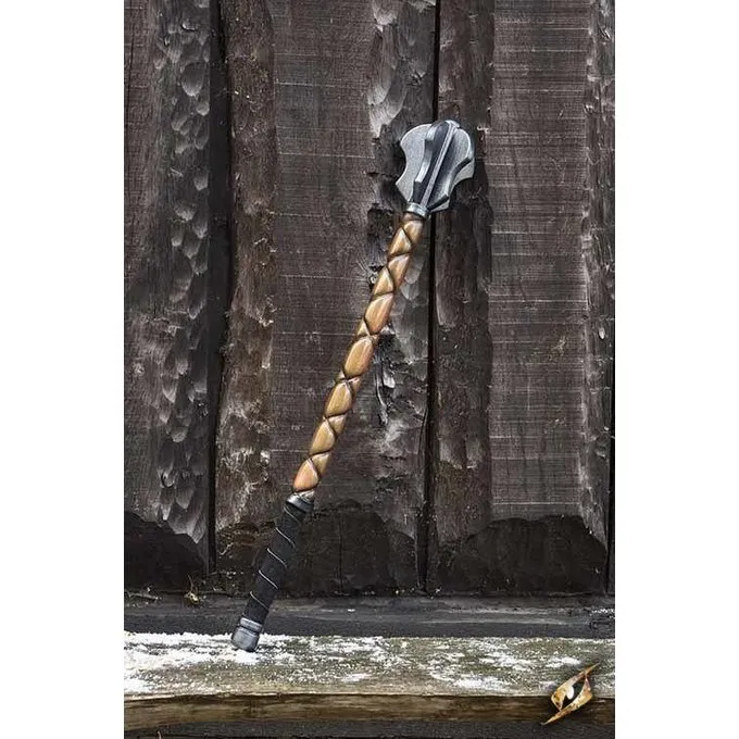 Skull Crusher mace, a foam LARP weapon. The total length of this mace is 82 cm with a grip of 17 cm, a 13 cm head and the spikes are 5 cm. It has a flexible glass fibre core and a durable layer of foam that is coated with a strong layer of latex. The Imperial is handmade and manually colored so every item is unique. Because of the material we do not recommend leaving it in the sun for a longer period of time. This Epic Armoury mace meets high safety standards.