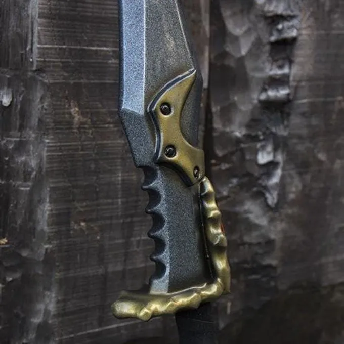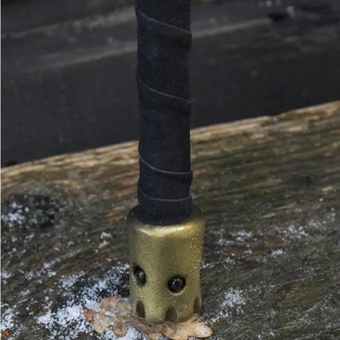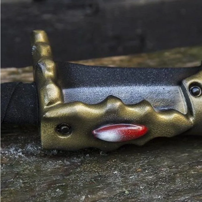 Soul Stealer, LARP sword with a gold-colored pommel, cross-guard and ornaments. This weapon has a glass fibre core with a layer of durable foam that is coated with a strong layer of latex. The total length of the sword is approx. 110 cm, with a blade of 80 cm, a grip of 24 cm and it weighs 420 g. The tip is enforced with kevlar, for extra security. The sword is handmade and manually colored so every item is unique. Because of the material we do not recommend leaving the sword in the sun for a longer period of time. Epic Armoury swords meet high safety standards.
