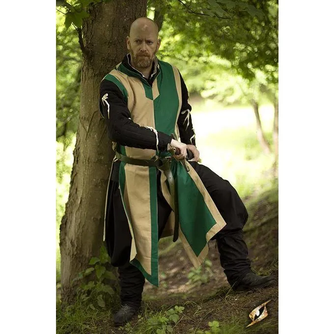 This tabard is inspired by historical originals and can be worn over armor or medieval clothing. On the side it has ribbons to fasten it. On the sides, front and back, it has splits for optimal freedom of movement. Suitable for medieval re-enactment, LARP and festivals.