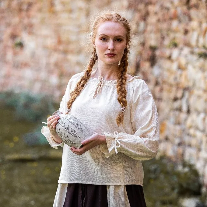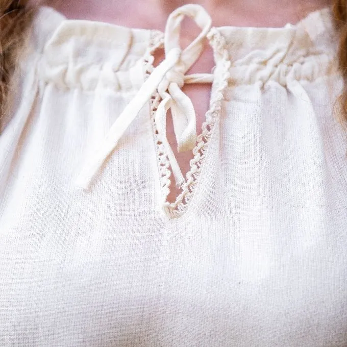 This blouse is made of cotton and the sleeves and neck are lined with lace. The neckline can be closed with two cords. The blouse is available in the sizes S up to XXXL.