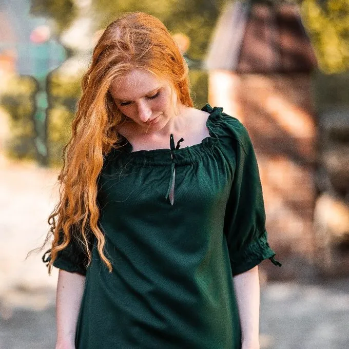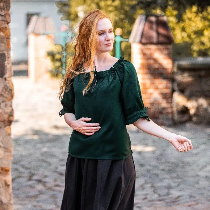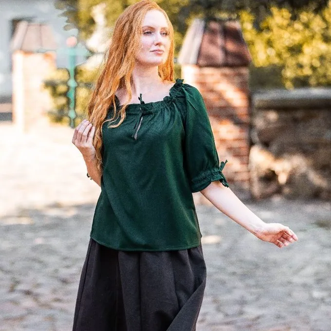 This blouse has half-length sleeves and is made of cotton. The sleeves and neck are lined with elastic so the blouse can be worn with bare shoulders. The blouse is available in the sizes S up to XXXL in the colours black, green, red, white and cream.