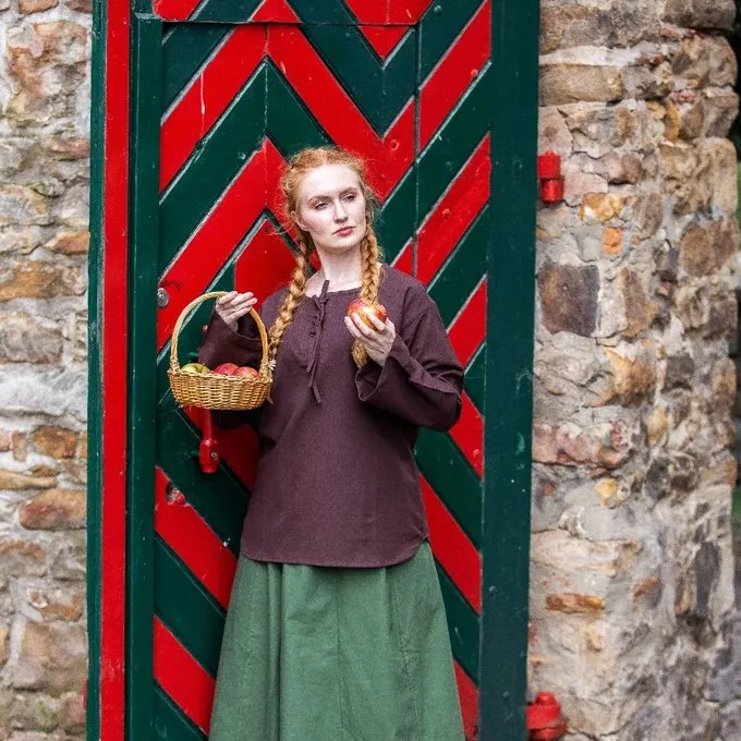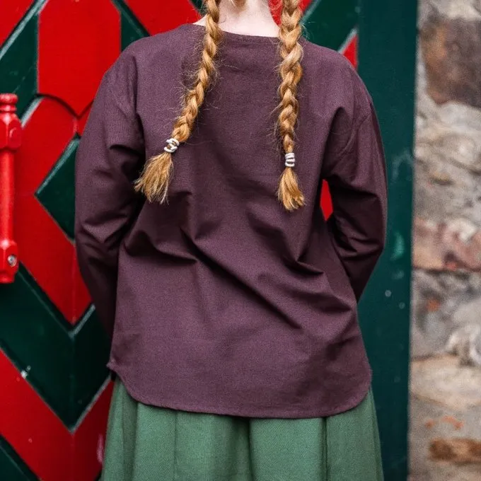 This blouse is made of cotton. The neckline can be closed with a cord. It is available in the colours black, blue, white, cream and brown in the sizes S up to XXXL.