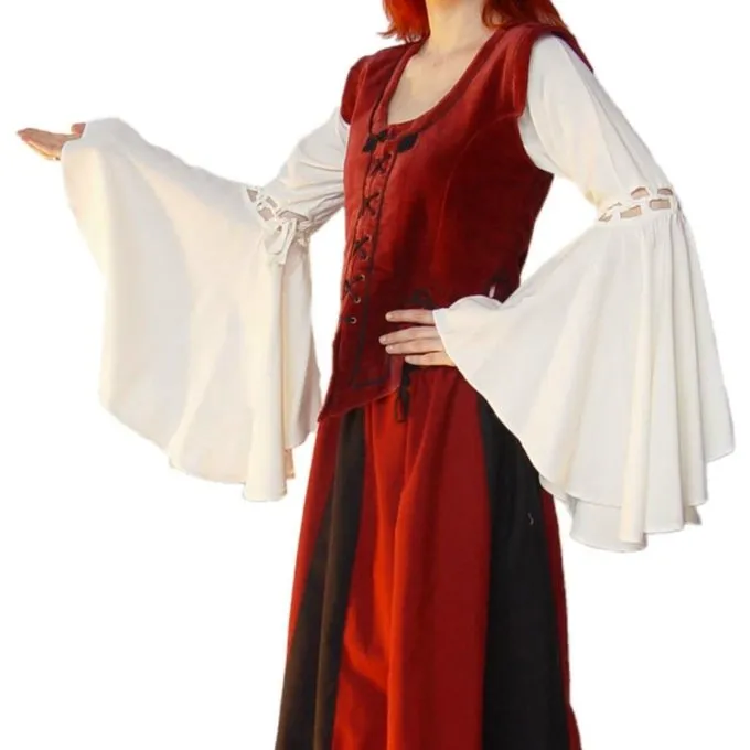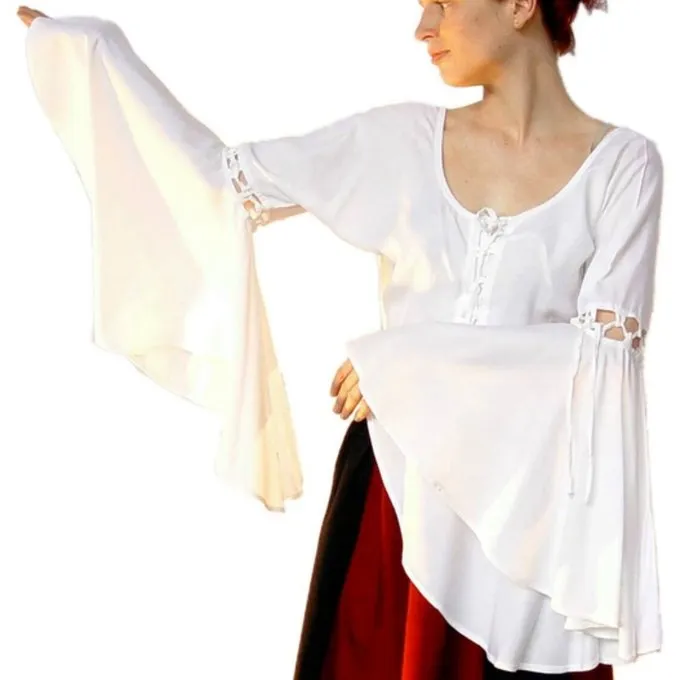This blouse is made of viscose and lets the belly button visible. At the front it can be laced up with a cord and it has wide ending sleeves. It is available in the colours red, black and white in the sizes S up to XXXL.
