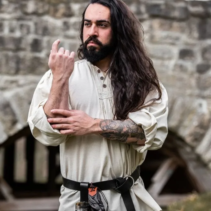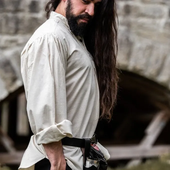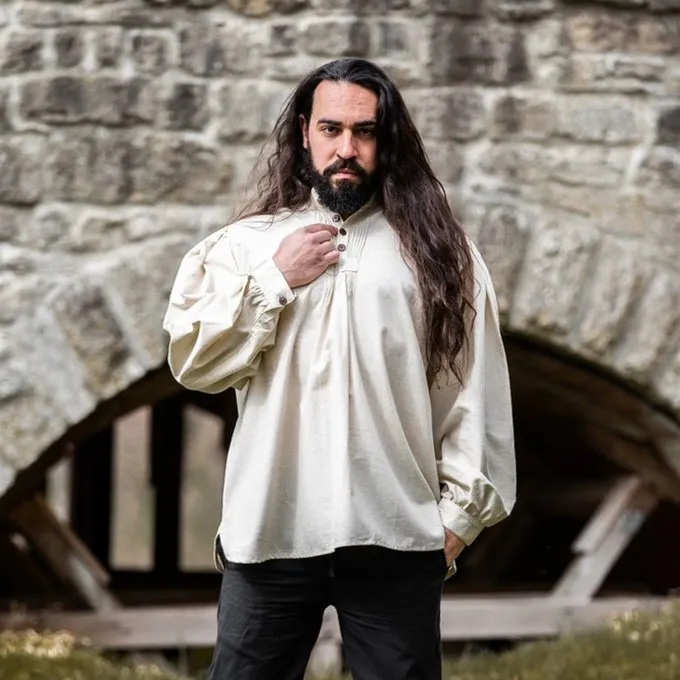 This shirt can be closed with wooden buttons. It is available in the colours white, cream, black and red in size S up to XXXL, please see the drop down menus above. The cream version is made of a cotton linen mix, the other versions are made of cotton.