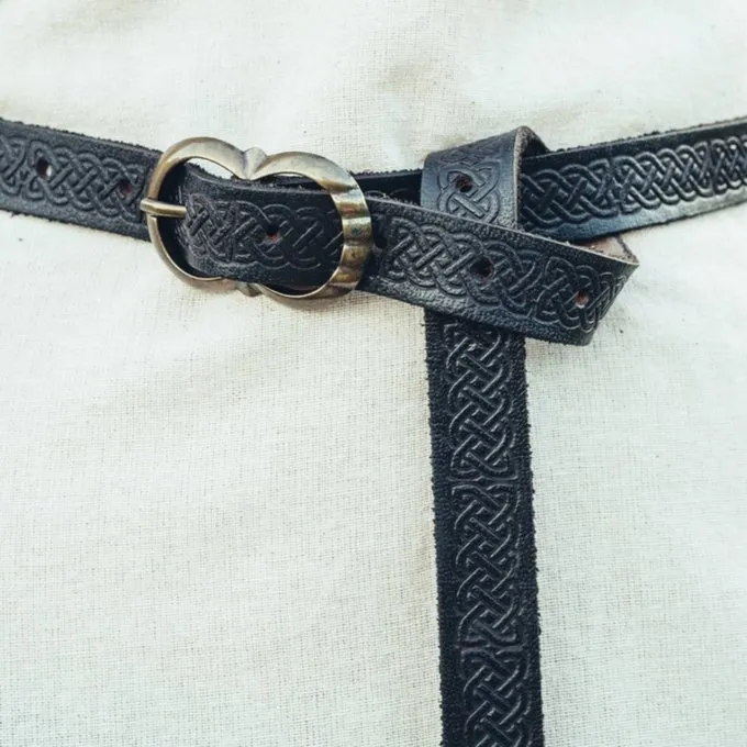 An ideal belt for dresses and tunics that gives a better fit to historical clothing. It is beautifully decorated with a Celtic knot motif. The belt has a medieval bronze colored buckle.