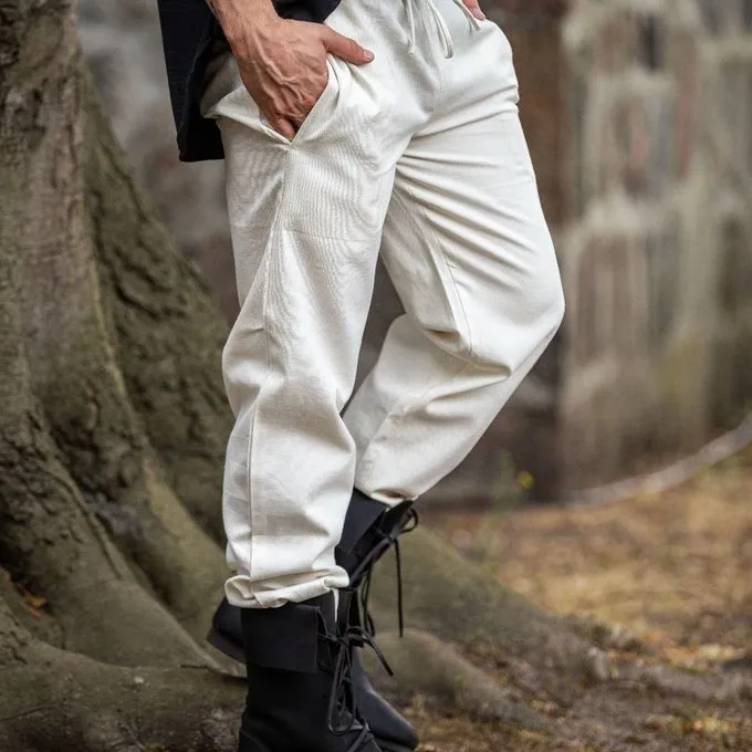 These trousers are completely made of cotton and have an elastic band at the waist where they can be fastened with a cord. This garment is available in the colours black, cream, light brown, dark brown and blue in the sizes S up to XXXL.