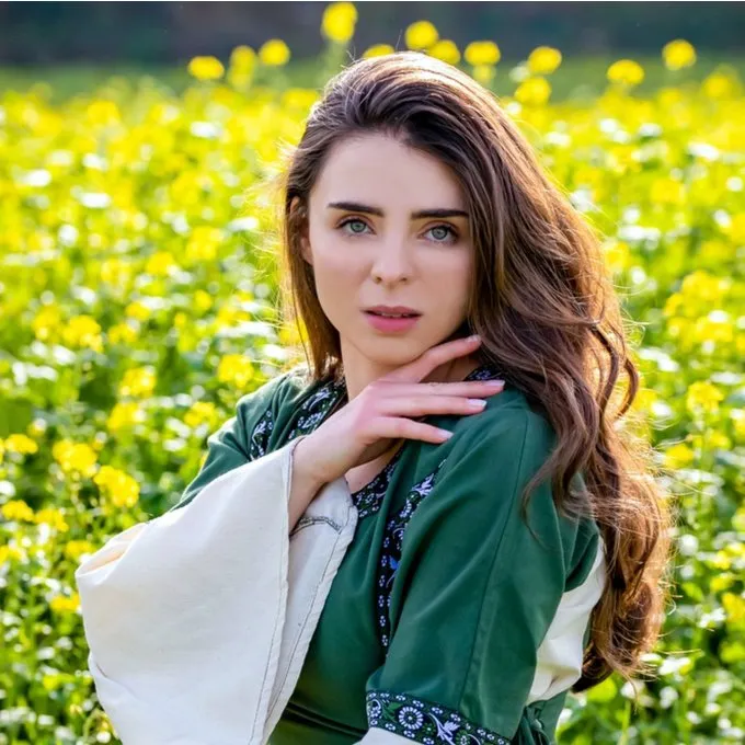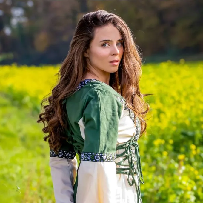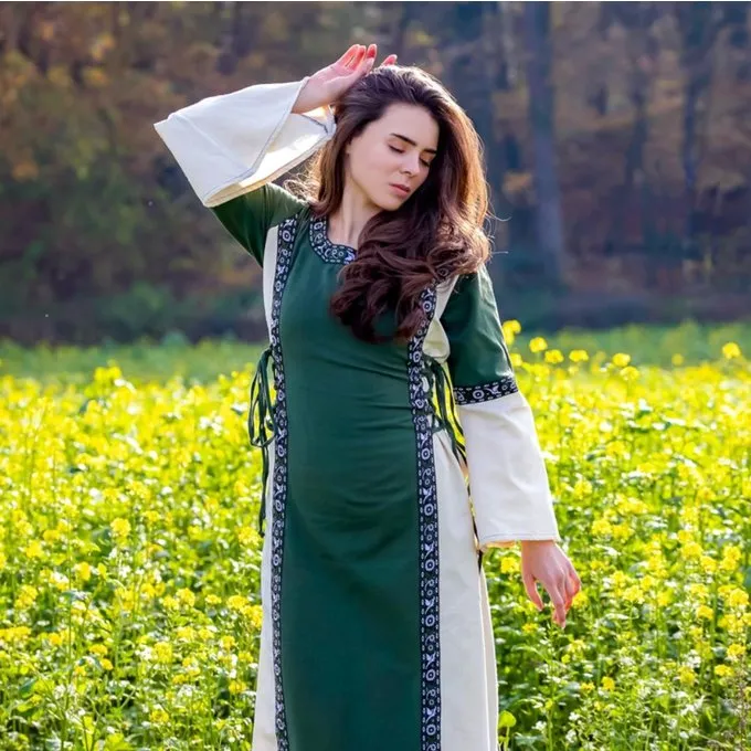 This dress is made of cotton. At the front, neckline and sleeves it is ornamented with decorative bands that give the dress a sophisticated character. Both sides have cords for an optimal fit. The dress is available in the sizes S to XXXL.