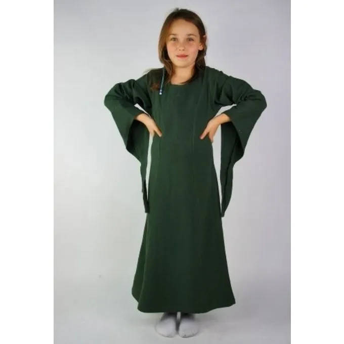 This dress is made of cotton and has wide ending sleeves. It can be tightened with a cord at the back and it can be worn in combination with a belt or an apron. The dress is available in size XXXS to XS in green, red and cream.