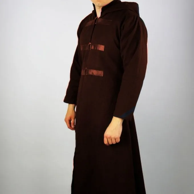 This black, long coat is made of wool and is lined with cotton. It is lined with cotton. It can be closed with three straps at the front and it has a hood. It is available in size S up to XXXL.
