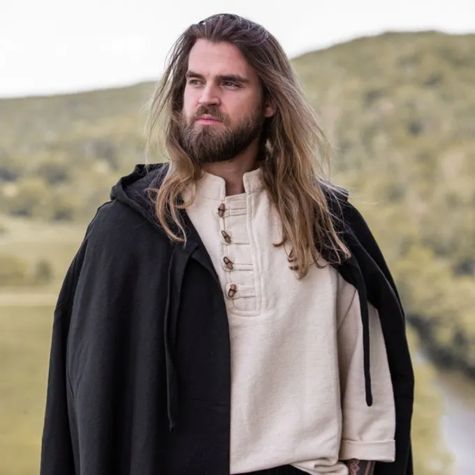 A functional medieval cloak suitable for re-enacting several periods. This cloak protects from the rain, wind and sun. Perfect for summer and winter encampments. The cloak is made of wool mix and is available in the colors: black, red, green, brown, grey, dark blue.