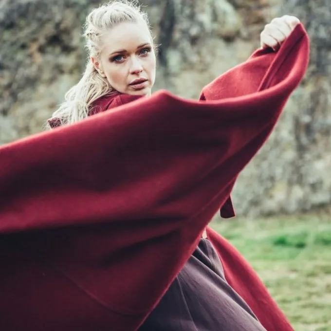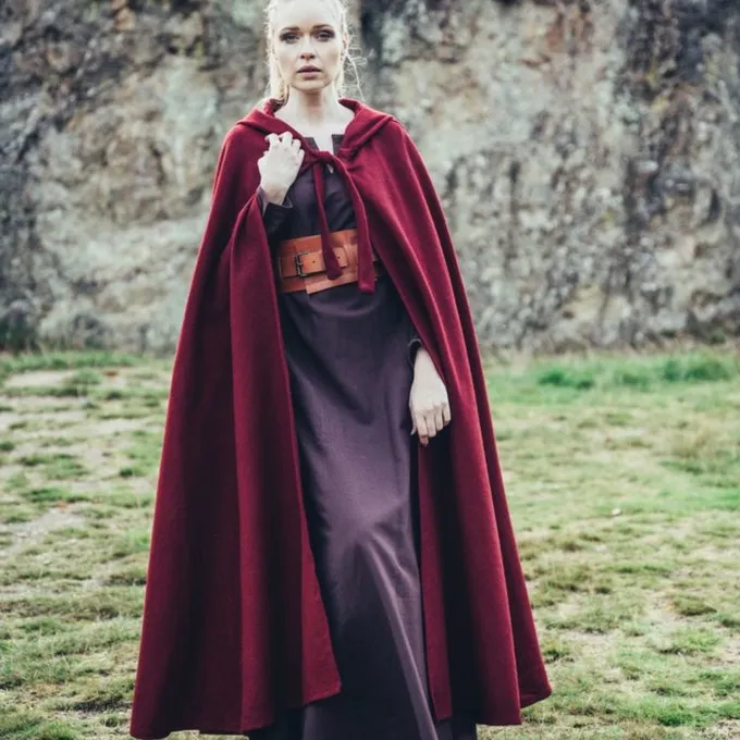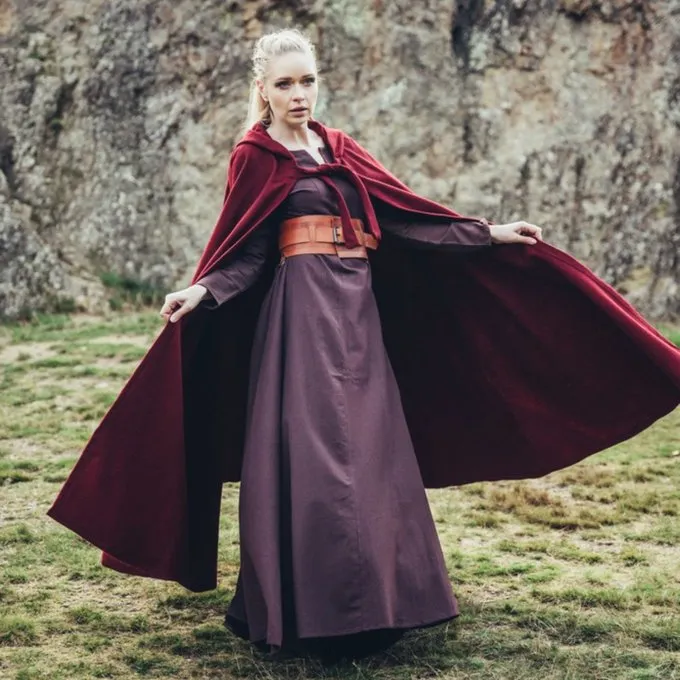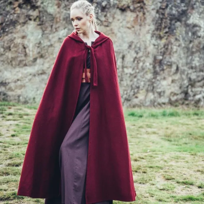 A functional medieval cloak suitable for re-enacting several periods. This cloak protects from the rain, wind and sun. Perfect for summer and winter encampments. The cloak is made of wool mix and is available in the colors: black, red, green, brown, grey, dark blue.