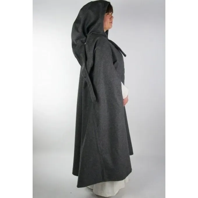 This wool mix cloak with long hood keeps you warm and dry during the cold months of the year and rainy spring and summer days. The fabric is slightly water resistant.