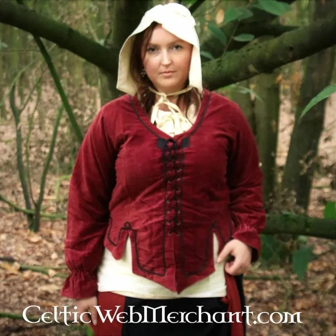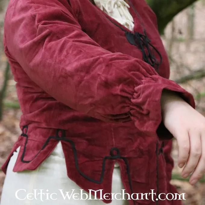 This jacket is made of black velvet. The front and the sleeves are laced up with cords. The edges are decorated with black thread. It is available in the sizes S up to XXXL.