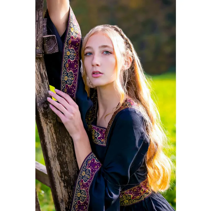 This Medieval dress is inspired by historical paintings. The dress has trumpet sleeves which was an absolute status of wealth. This dress is made of viscose. It is trimmed with polyester embroidery.