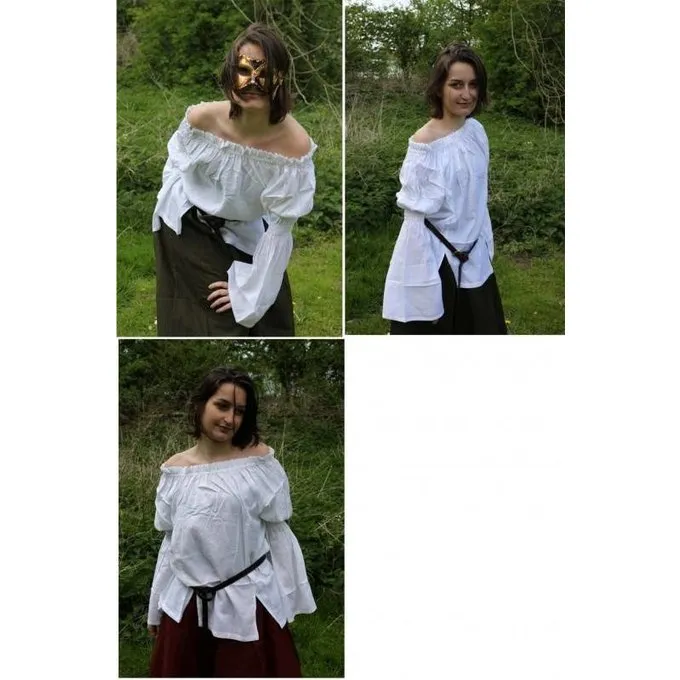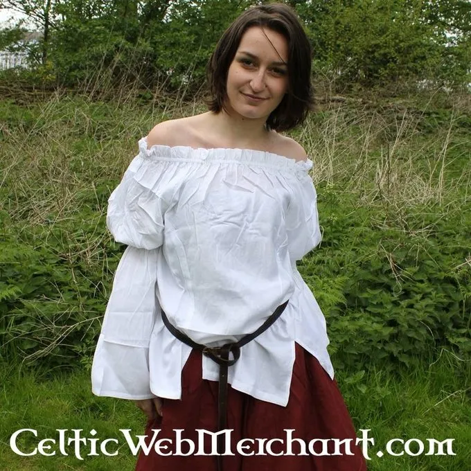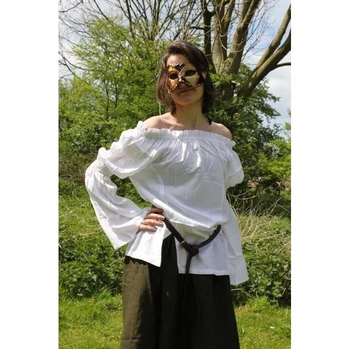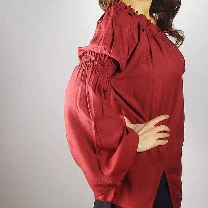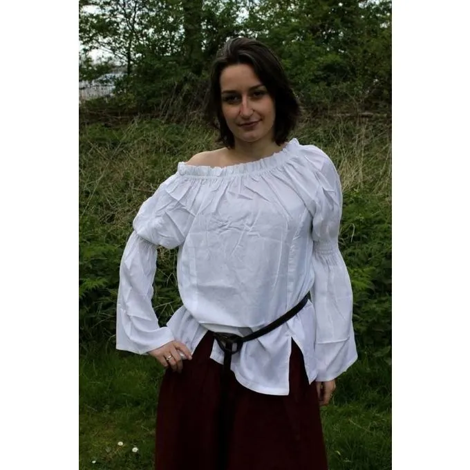 The sleeves and neck of this blouse are lined with elastic so the blouse can be worn with bare shoulders. The blouse is available in the sizes S up to XXL in the colours brown, red, black, white and cream. The brown and cream version are made of cotton mix, the other colours are made of viscose.