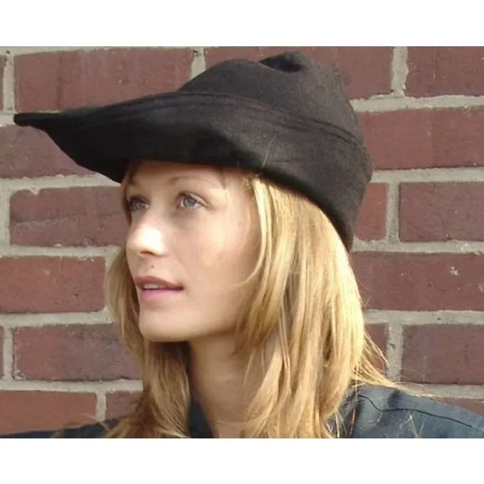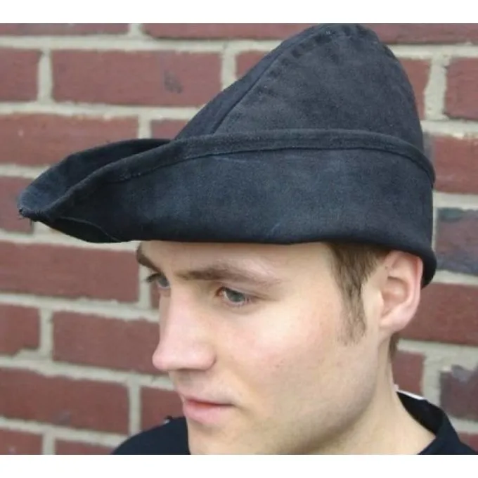 Robin of Locksley is often depicted with a headdress like this. This hood is made of leather. It is available in the colours brown and black and suitable for a head circumference up to 63 cm.
