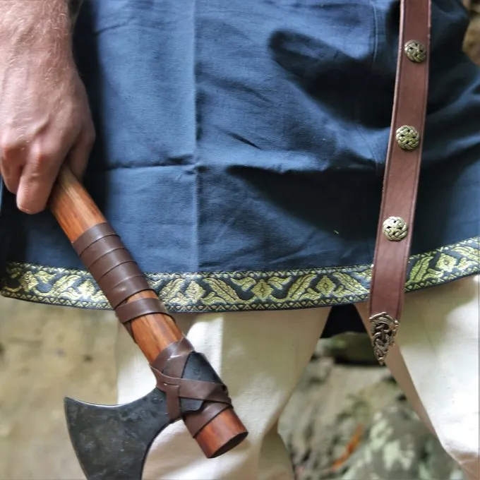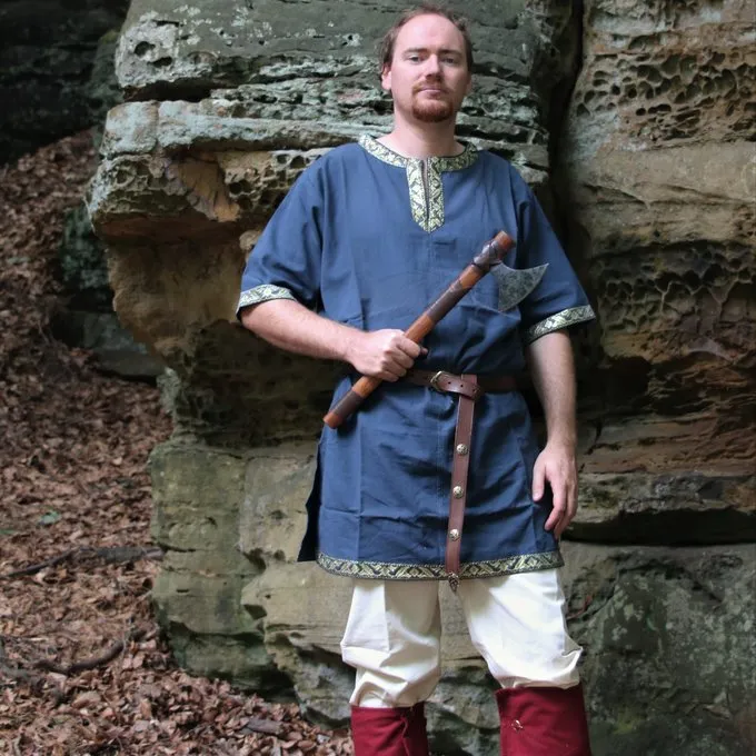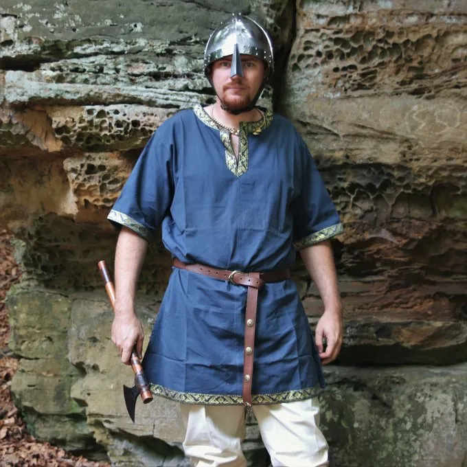 This long short-sleeved tunic has elegant embroidery based on medieval gold thread patterns.