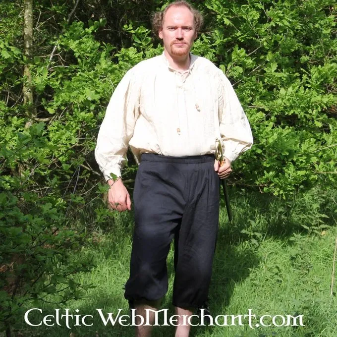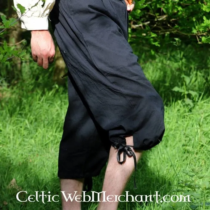 The three-quarter trousers became a popular garment at the 16th and 17th century courts and became known as the Culotte. These trousers are made of cotton and they have two pockets. They have cords to fasten the ends. They are available in the sizes S up to XXL in the colours black, green and red.