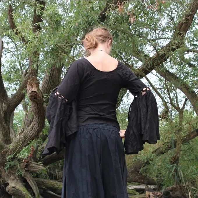 This top is made of viscose. The sleeves are wide ending from the elbows and the front can be laced up with cords. It is available in the colours white, black and cream in the sizes S up to XL.