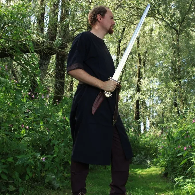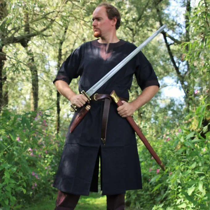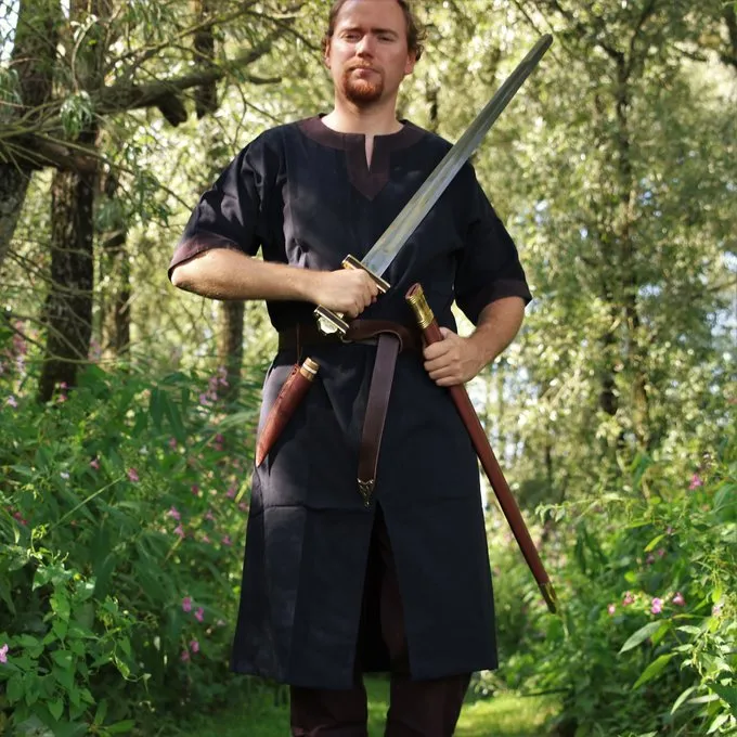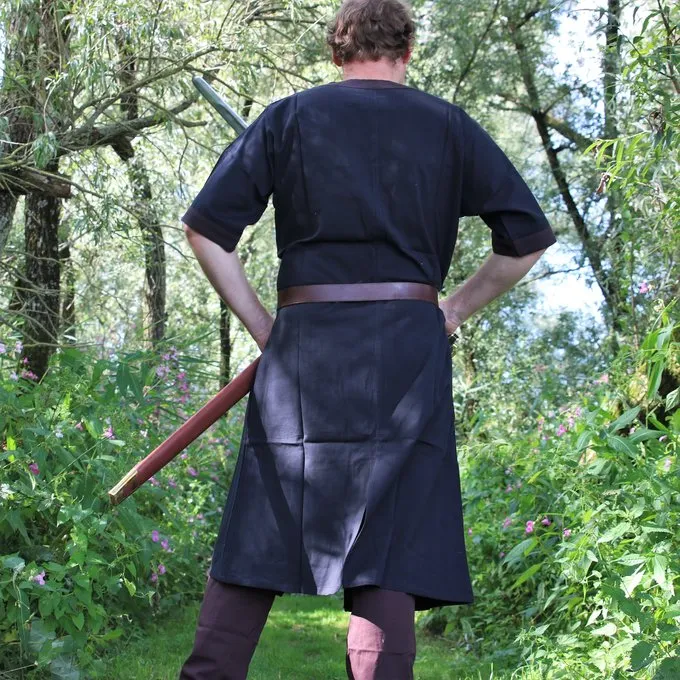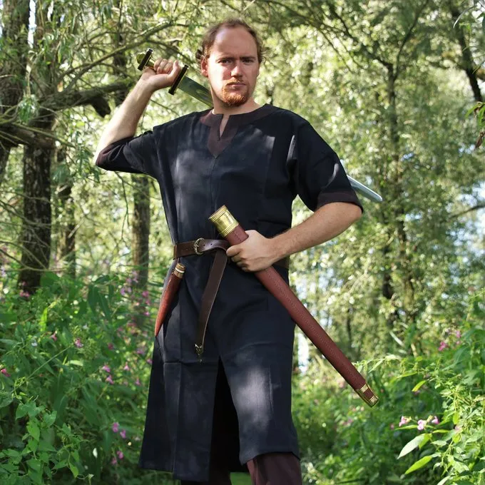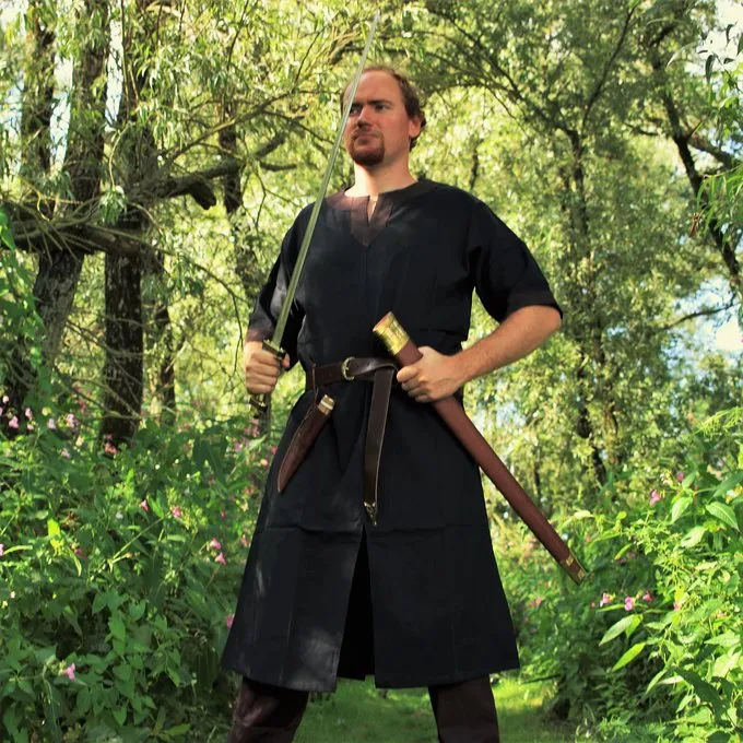 This type of tunic was a basic piece of clothing worn by men all over Europe during the Early to Late Middle Ages. The tunic can be worn on its own, or as an undergarment under a tunic of another colour. In colder climates, it was often combined with trousers and leg wrappings.
