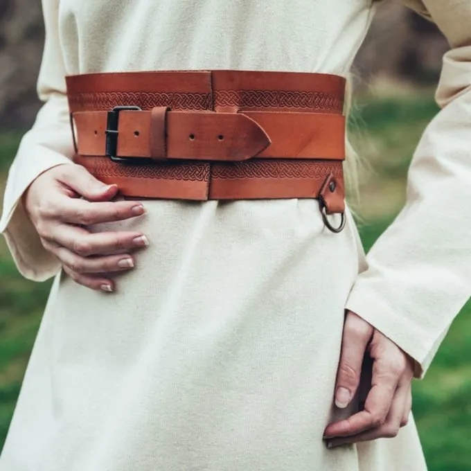 This wide waist belt is decorated with a beautiful pagan knot pattern and available in different sizes. It is suitable for both tunics and dresses. A nice accessory for your Viking outfit, Valkyre costume, LARP characters and Insta photos. Because you can adjust this belt to size, it immediately gives your costume an elegant fit. The belt has 3 rings on which you can hang accessories such as a weapon holder or bag. You can wear the belt 15 cm tighter than the chosen size. For example, size 100 cm is adjustable up to 85 cm.