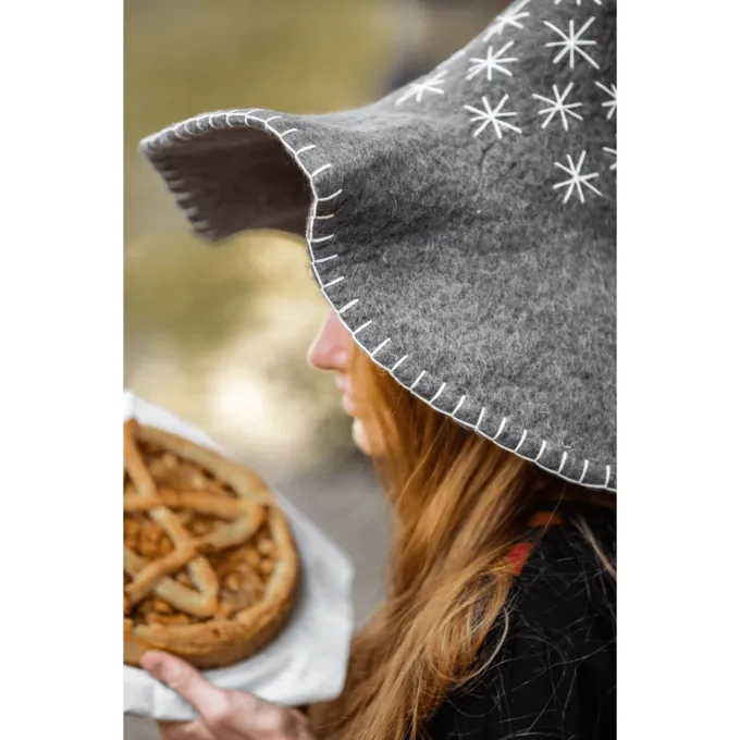 This luxurious witch hat is an indispensable accessory for every witch. The hat is made of wool felt and has an extra wide brim, so you can better hide your hair or face. It also offers the option of incorporating branches into the hat, for example.