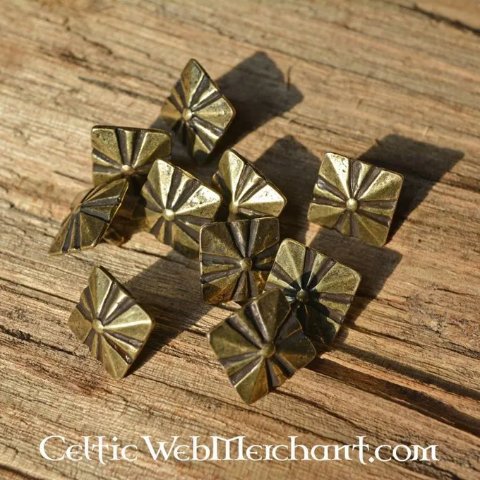 This belt fitting is based on several 16th century originals excavated at several sites all over Europe. The fitting is made of brass or silvered brass and measures 1,3 x 1,3 cm.
