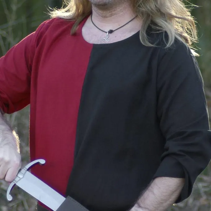 This tunic is based on 12th-15th century garments depicted on paintings and in medieval manuscripts. Tunics like this were worn by men from all classes of society during the Middle Ages. This tunic is dyed in the mi-parti style, an art style that was used all over Europe during the 13th century.