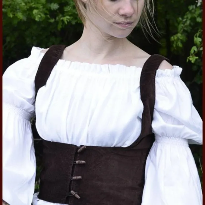 This ladies’ waistcoat can be worn over a blouse or dress for a perfect Medieval or Renaissance outfit. The waistcoat has wooden buttons and a lace up at the back to close it.