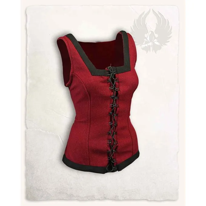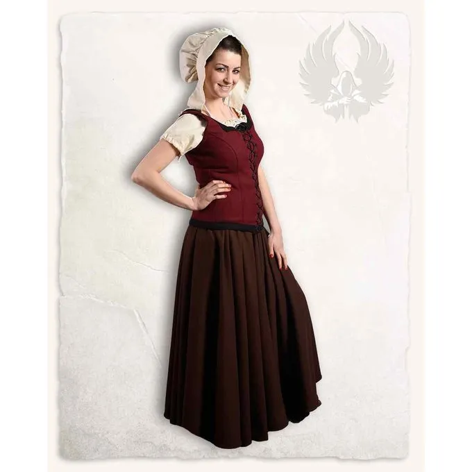 Worn over an undergarment or dress, the “Ursula” bodice warms on cool days and protects against light rain. Worn loosely as a waistcoat or tightly laced and closed with the lacing on the front, the bodice can be brought into the desired shape.