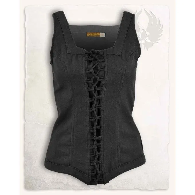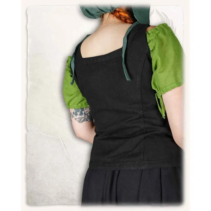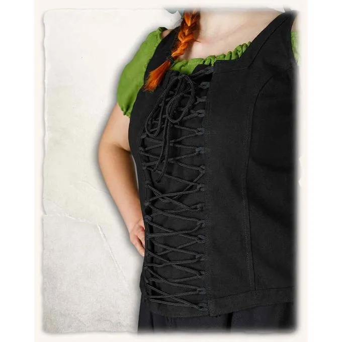 Worn over an undergarment or dress, the “Ursula” bodice warms on cool days and protects against light rain. Worn loosely as a waistcoat or tightly laced and closed with the lacing on the front, the bodice can be brought into the desired shape.